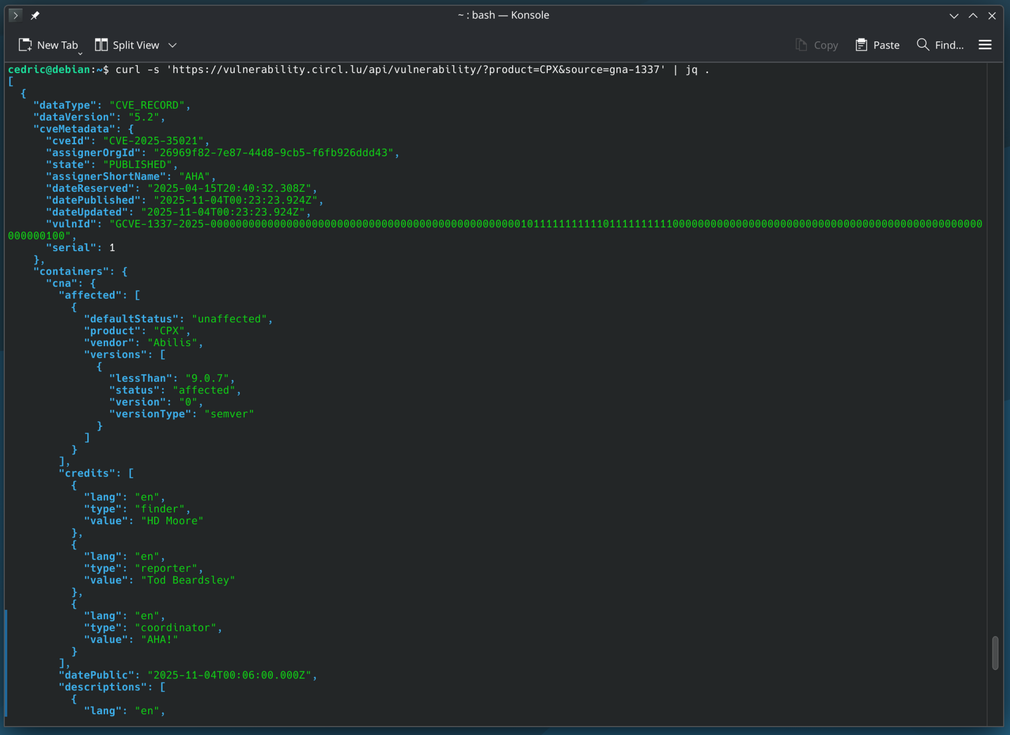 We’re delighted to announce the release of Vulnerability-Lookup 2.21.0. This release brings several important improvements focused on search, data ingestion, and usability.