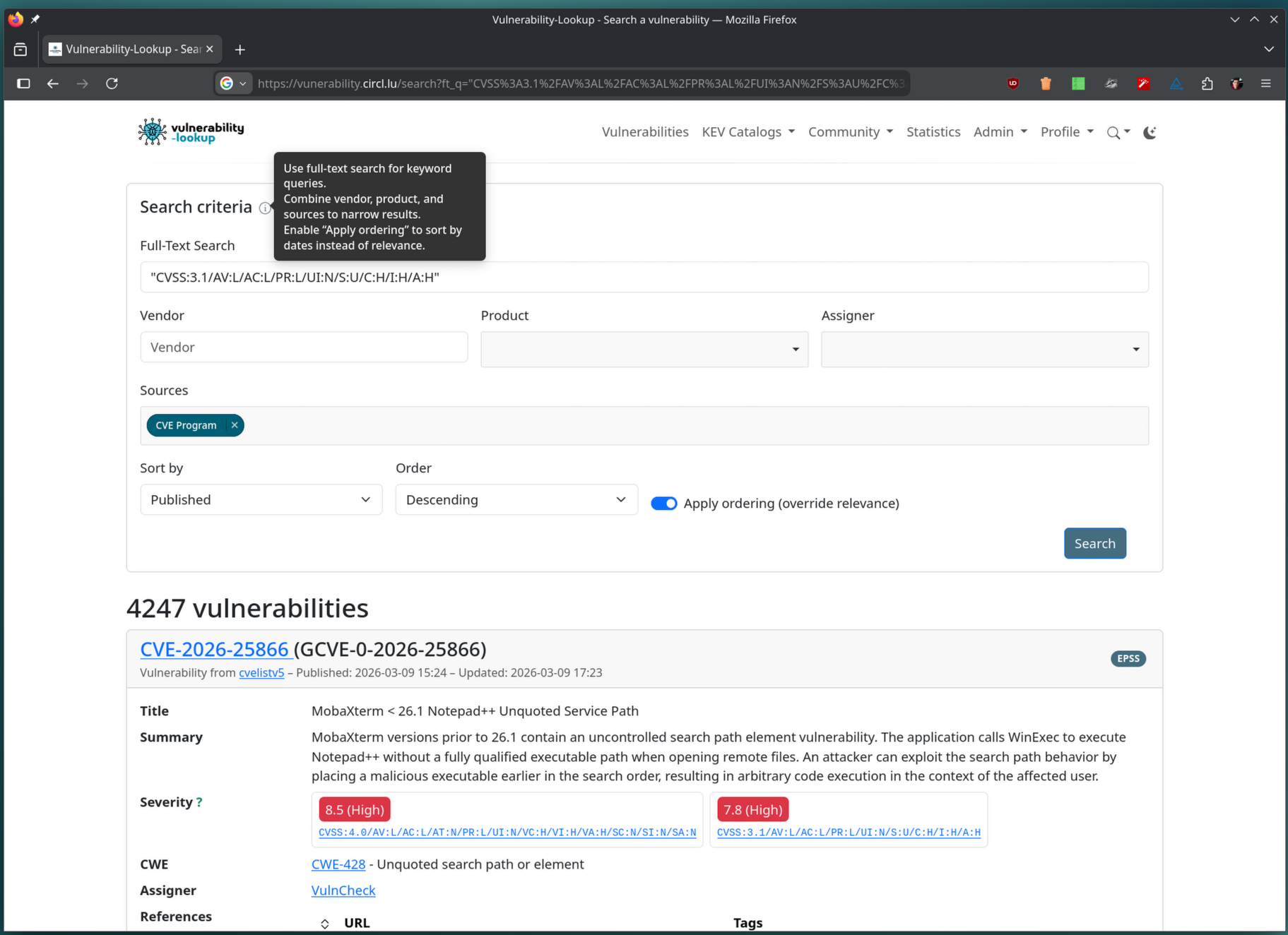 A new endpoint at /api/vulnerability/fulltext is now available for programmatic full-text searches.