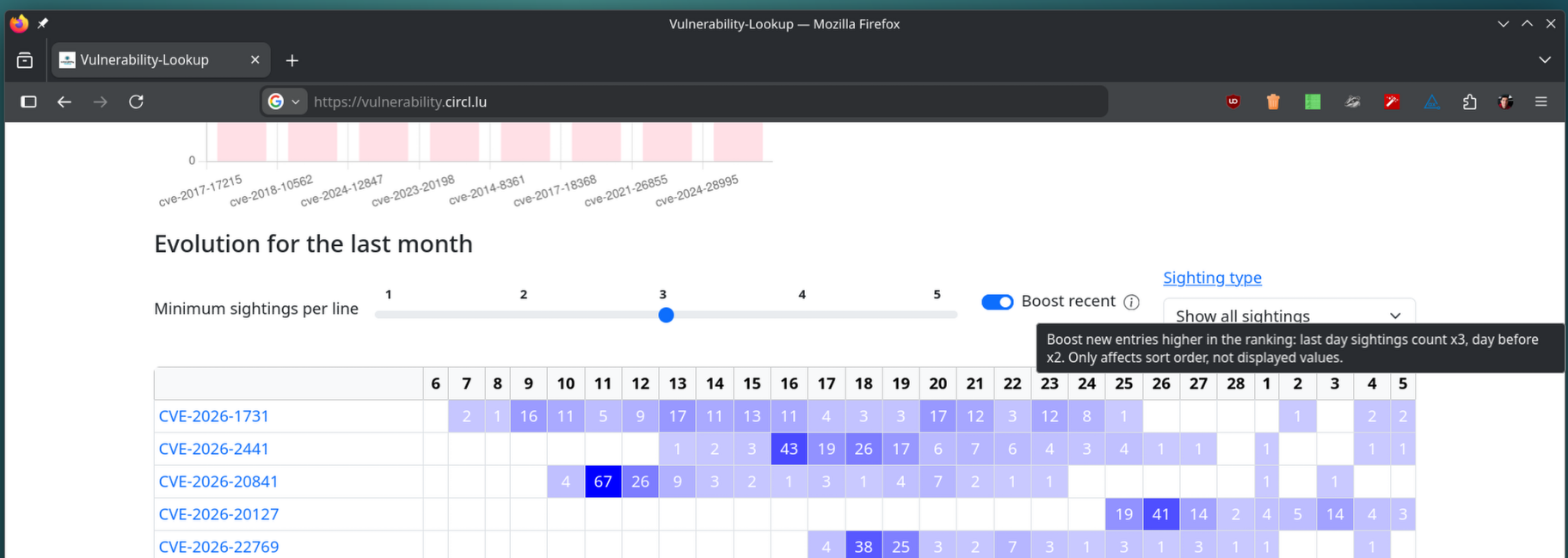 You can now toggle a “recency boost” in the sightings table to highlight the latest vulnerability activity. (e966a70)